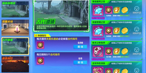 古代遗物中的装备是神器装备,主要是武器、首饰。用户兑换时需要消耗古代钱币、暮色刚玉、金币等道具。古代钱币主要来自于失美乐遗迹副本,暮色刚玉则可以通过分解装备获得,而金币可以用钻石兑换或者摆摊赚取。