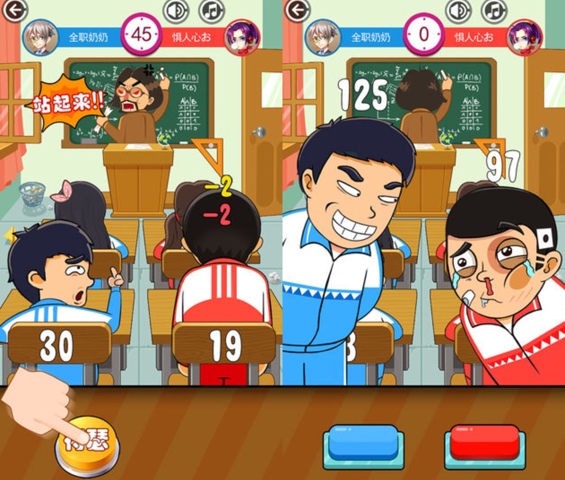 18岁的玩家都经历过课堂的紧张,这是一款可以在课堂偷偷开小差的游戏。代入感很强,玩家和同桌在上课时开展手速小游戏,比拼谁更快,但同时要注意时刻回头的老师,不要被发现偷偷开小动作,否则会被处罚暴打。一场手速掩护行动,班主任的压迫感再度袭来,课堂多个小动作游戏,拍手,击鼓传花等,再次和班主任斗智斗勇。魔性搞怪表情包,夸张动画式风格,再现中式课堂,红蓝经典校服,玩出不一样的课堂回忆。