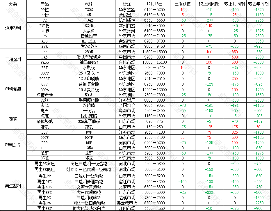 本周再生PVC市场稳中偏弱,部分价格弱势走低,幅度在100-200元/吨左右。截至12月18日收盘,河北白塑钢国标水洗破碎料价格为3200-3300元/吨,较上期收盘价格持平,均价3250元/吨,较上期均价持平;江苏白透明普通颗粒4200-4300元/吨,较上期收盘价格跌100元/吨,跌幅在2.30%,均价4330元/吨,较上期均价跌20元/吨,跌幅在0.46%。