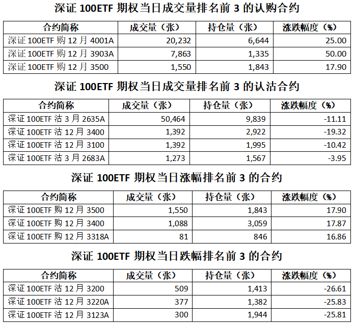 深证100ETF期权总成交面额30.18亿元,增加30.35%,期现成交比为0.02,权利金成交额0.11亿元;期权总成交量94,309张,增加33.79%,其中认购期权成交量33,869张,认沽期权成交量60,440张,认沽认购成交比率为1.78(上一交易日认沽认购成交比率为1.36)。