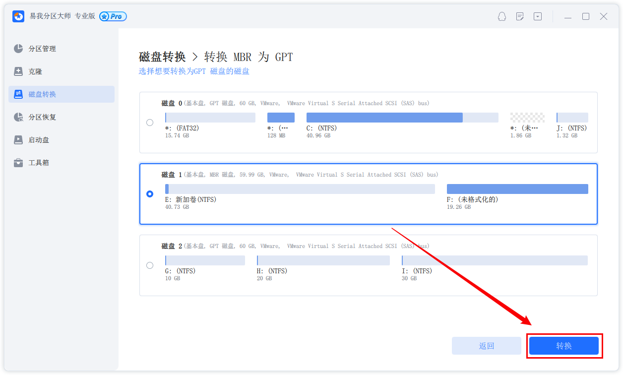 步骤2.选择需要转换的磁盘,点击【转换】,然后等待磁盘转换完成即可。