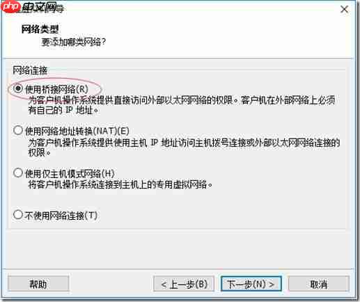 8、选择网络连接类型,这里选择“使用桥接网络”,根据实际需要选择适合的网络模式,安装向导中已对各种模式进行了详细说明,补充说明如下: