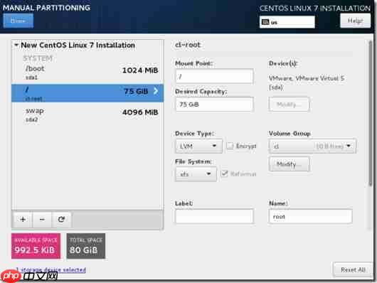 点击“installation destination”,进入如下界面,选中80G硬盘,**条到底部,选择“我将配置分区”,即自定义磁盘分区,**点击左上角的“done”进行磁盘分区规划: