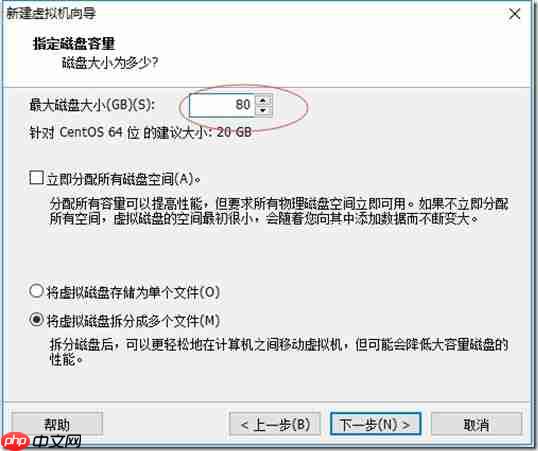 12、设置虚拟机磁盘大小,默认20G可能不够用,建议设置更大一些,这里设置为80G,然后点击“下一步”继续: