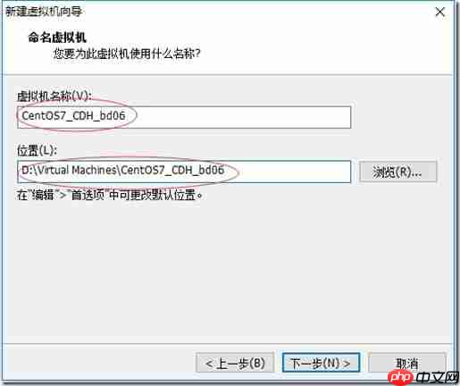 5、输入自定义的虚拟机名称,建议名称清晰明了,例如这里使用“CentOS7_CDH_bd06”,并指定虚拟机存储位置,例如“D:\Virtual Machines\CentOS7_CDH_bd06”,然后点击“下一步”继续: