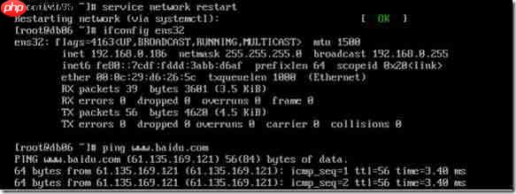 输入:service network restart命令重启网卡,使刚刚修改的IP地址生效,ping www.baidu.com测试网络连通性。